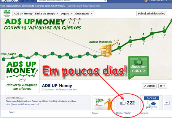 Em poucos dias da criação da nossa página do Ads UP Money no Facebook chegamos ao número de 222 pessoas que curtiram a nossa página do plugin, e estamos criando este post em forma de agradecimento a todos, gostaríamos muito de poder de ligar ou apertar a mão de todos, pois é realmente gratificando ver seu produto ser aceito por tantas pessoas. Também estamos mais convictos de que devemos usar ainda mais as redes sociais para divulgação de forma viral e grátis qualquer produto, seja um plugin para wordpress ou uma caneta mágica.